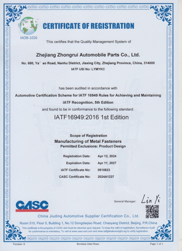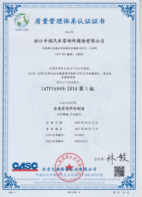 IATF 16949 là tiêu chuẩn quốc tế hàng đầu cho các hệ thống quản lý chất lượng ngành công nghiệp ô tô. Đạt được chứng nhận này chứng minh rằng Chiết Giang Zhongrui đã thực hiện một hệ thống mạnh mẽ tập trung vào phòng ngừa khiếm khuyết, giảm biến thể và chất thải trong chuỗi cung ứng và đảm bảo sự hài lòng của khách hàng.